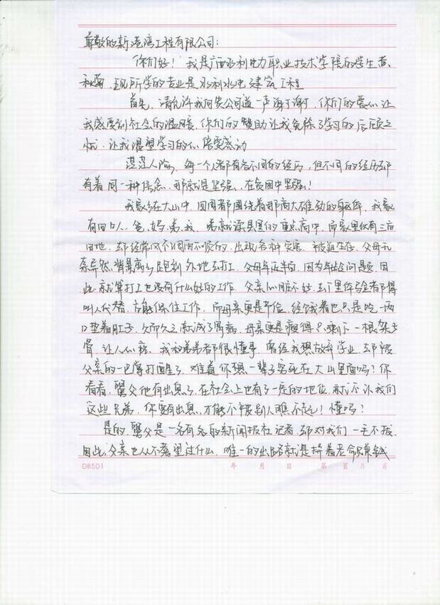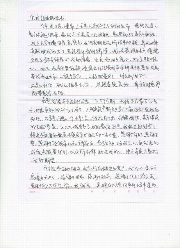 今年,弟又患了重病,上天差點就奪去了他的生命,最終還是從鬼門關(guān)逃了出來,弟動手術(shù)花近上萬塊錢,家里的積蓄所剩無幾,我上大學(xué)的費用是靠貸款及向親朋好友所借來的錢,幸運之神敲響我的大門,在絕望中看到了希望,我萬分感激新港灣公司及學(xué)校領(lǐng)導(dǎo)對我的厚愛,讓我拾回了信心,對學(xué)習(xí)的信心。因此,我有必要向新港灣公司匯報我本學(xué)期期末考試成績。考試專業(yè)科:工程力學(xué) 80; 工程測量 81;工程制圖 74;公關(guān)與禮儀、就業(yè)指導(dǎo) 優(yōu)秀;思想道德良好;體育與健康 89;高等數(shù)學(xué)及格。