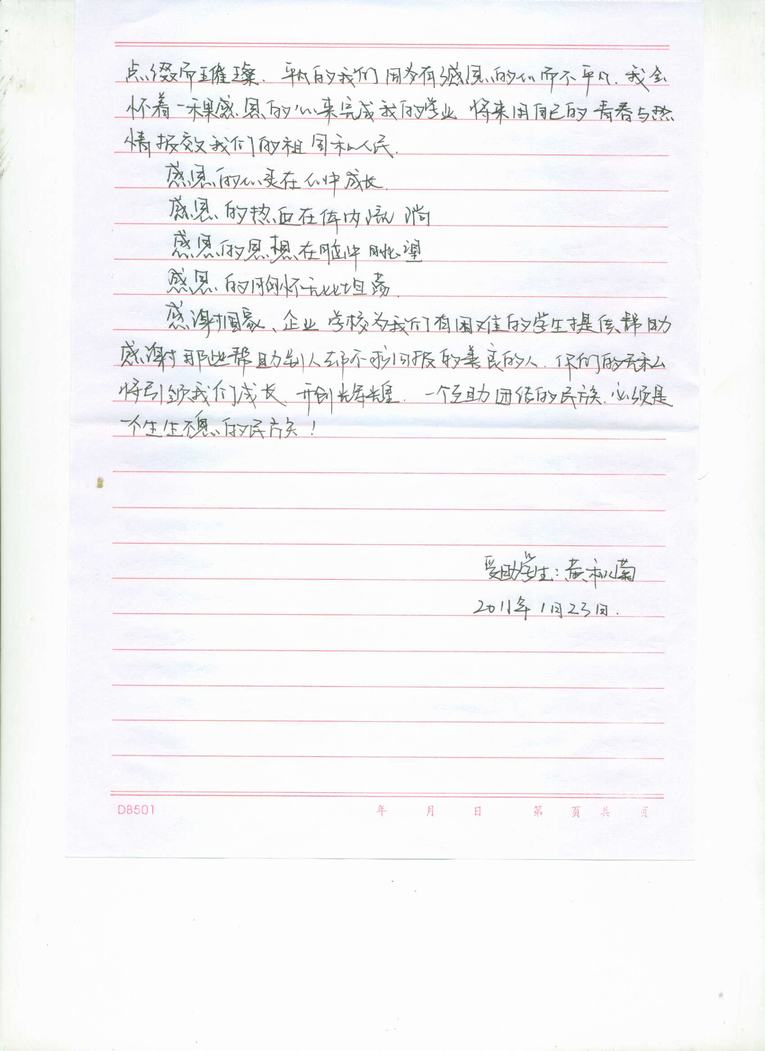 感謝國家、企業(yè)、學(xué)校為我們有困難的學(xué)生提供幫助,感謝那些幫助別人卻不求回報的善良的人,你們的無私將引領(lǐng)我們成長,開創(chuàng)輝煌。一個互助團結(jié)的民族必須是一個生生不息的民族!