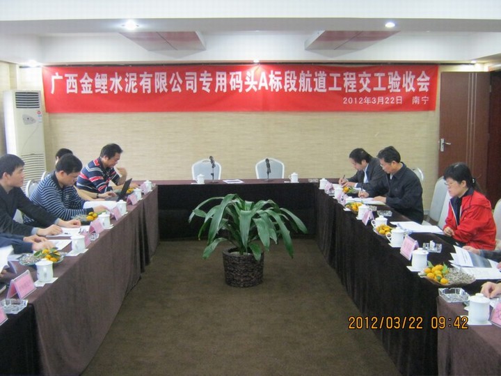 2012年3月22日廣西金鯉水泥有限公司在南寧召開的廣西金鯉水泥有限公司專用碼頭A標(biāo)段航道工程交工驗(yàn)收會(huì)。工程順利通過(guò)國(guó)家竣工驗(yàn)收并取得合格證書,標(biāo)志廣西新港灣工程有限公司承建的金鯉水泥專用碼頭正式達(dá)到竣工條件。