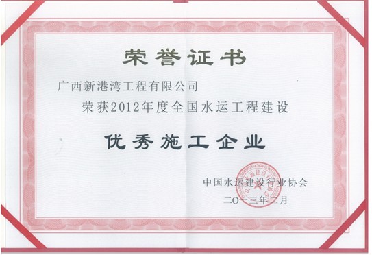 根據(jù)中國水運建設(shè)行業(yè)協(xié)會文件,中水協(xié)字[2013]24號《關(guān)于表彰“2012年度全國水運工程建設(shè)優(yōu)秀施工企業(yè) ”的通知》,2012年全國水運工程優(yōu)秀施工企業(yè)的評選工作己經(jīng)結(jié)束。經(jīng)審定,共有包括廣西新港灣工程有限公司在內(nèi)的二十七家企業(yè)榮獲“2012年度全國水運工程建設(shè)優(yōu)秀施工企業(yè)”稱號。