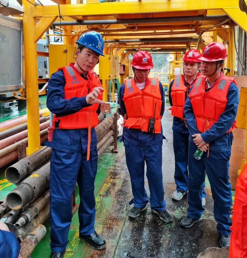 隨后寧董和姚董在項(xiàng)目部管理人員的陪同下來(lái)到新港灣81號(hào)船組,現(xiàn)場(chǎng)慰問(wèn)一線施工人員。寧董和姚董實(shí)地察看航段內(nèi)的施工現(xiàn)場(chǎng),參觀了公司自主設(shè)計(jì)建造的內(nèi)河炸礁船,并與船組同事深入交流探討船機(jī)設(shè)備技術(shù)和施工工藝流程。