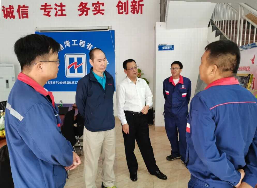 2021年10月20日,廣西新港灣工程有限公司創(chuàng)始人寧旭展先生在公司董事長(zhǎng)姚方明的陪同下蒞臨來(lái)賓至桂平2000噸級(jí)航道工程項(xiàng)目部(以下簡(jiǎn)稱(chēng)來(lái)桂項(xiàng)目)現(xiàn)場(chǎng)察看并慰問(wèn)一線員工。